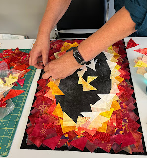 4. As you lay the triangles on the black felt do not extend the triangle past the edge of the felt. You will want an irregular, 'pointy' edge that you will trim later to give a more dynamic edge.
